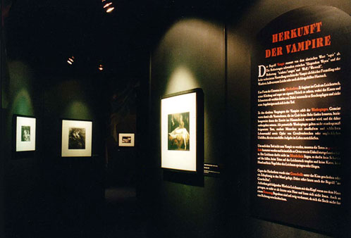 Komplette Gestaltung in Schwarz und Rot. Szenarische Ergänzungen mit plastischen Gruften, Gräbern und Rauminstallationen. Unterschiedliche Medienintegrationen wie Monitore, sprechende Vampirfigur und Projektionen. Exponate wie Kostüme, Filmausschnitte, Plakatsammlung und historischen Bildreplikaten.