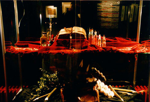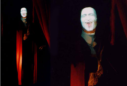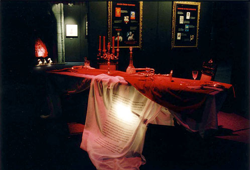 Komplette Gestaltung in Schwarz und Rot. Szenarische Ergänzungen mit plastischen Gruften, Gräbern und Rauminstallationen. Unterschiedliche Medienintegrationen wie Monitore, sprechende Vampirfigur und Projektionen. Exponate wie Kostüme, Filmausschnitte, Plakatsammlung und historischen Bildreplikaten.