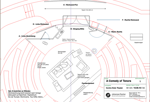 Arena Bühne mit kreisförmig angelegten Zuschauerreihen. Fortsetzung des Spielortes im Zuschauerraum mit großformatigen Illustrationen. Deutschsprachige Erstaufführung.