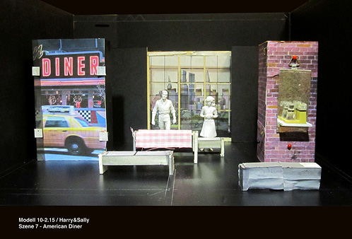 Umsetzung mit einer Rückprojektionswand für schnelle Szenenwechsel und Einspielung von Filmmaterial. Möblierung mit einem zentralem Multifunktionsmöbel. Mittig ein Skylinefenster mit unterschiedlichen Bespielungsmöglichkeiten und integrierter Beleuchtung.