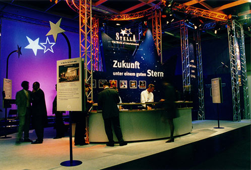 Idee: Unternehmensstand mit Portfoliopräsentation und besonderen Hinweis auf Partnerunterstützung. Einführung der neuen CI mit blauem Sternenfont.