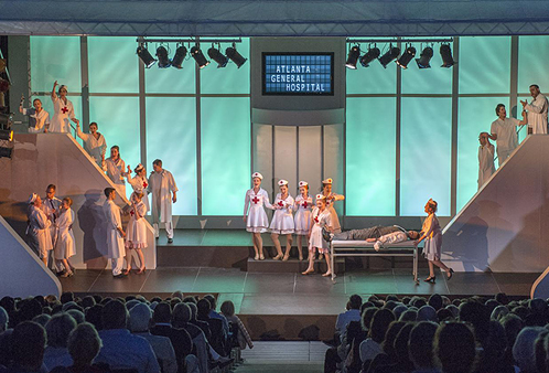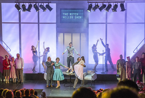 Die rasant wechselnden Spielorte des Musicalswerden ohne Umbauten durch Farbwechsel der Rückwand und Anzeigetafel realisiert. Die Stufenpodesterie ermöglicht eine optimale Sicht auf die 30 Darsteller mit neun Auftrittsmöglichkeiten.