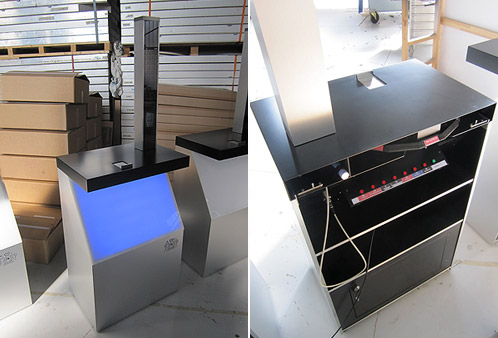Umsetzung mit Drehteller, pogrammierter Leuchtfläche und gekoppelten Lichtkästen im Pylon. In Kofferraum transportabel und ohne Werkzeug aufbaubar.