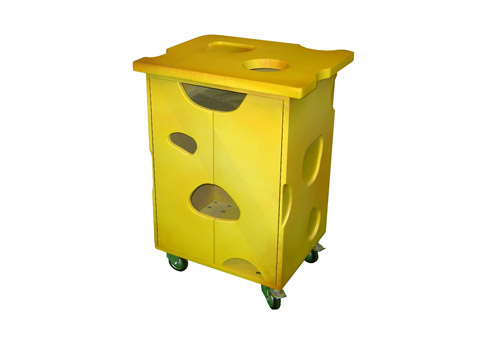 Aluminiumsystem mit Steckscharnieren, bedruckte Forexplatten anklettbar, gerundete Rückwand als Fotohintergrund schwenkbar als Durchgang. Zusatzelemente Käsetisch für Technik und Give aways. Objekte wie Käsebank und Duftschnecke.